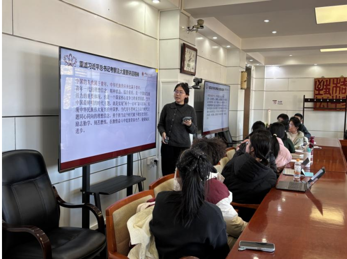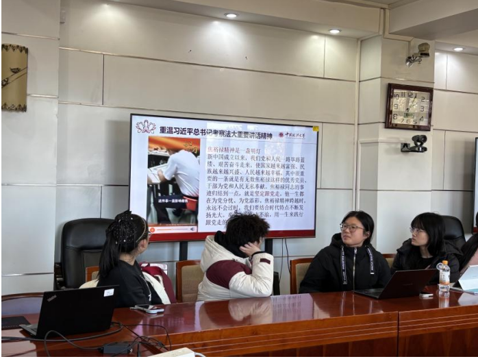团支部书记程程带领大家一同学习了习近平总书记考察中国政法大学重要讲话精神和党的二十届四中全会精神。习近平总书记在我校考察时指出:中国的未来属于青年,中华民族的未来也属于青年。当代青年要树立与这个时代主题同心同向的理想信念,勇于担当这个时代赋予的历史责任,励志勤学、刻苦磨炼,在激情奋斗中绽放青春光芒、健康成长进步。习近平总书记强调,焦裕禄精神是一盏明灯,焦裕禄同志的事迹归结到一点,就是坚定跟党走,他一生都在为党分忧、为党添彩。