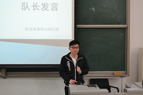 一段振奋人心的短片过后,田径队队长马维俊首先发言。马维俊队长强调“不畏苦,不怕输”六字精神,最后半个月更要加紧努力,要求各个队长诚心待人、作好表率。并以400米跑举例,最后100米拼的是一口气,关键看队员们想不想赢、敢不敢冲、敢不敢赢,寄希望于参加比赛的队员们,拼好这一口气。同时,马维俊还送给大家一句话:等那日载誉归来,再谈那玉兰花下。