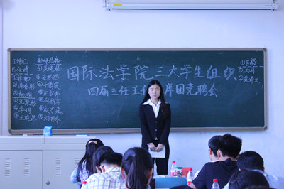 2014年5月20日下午13点30分,国际法学院四届三任学生组织主席、主任团竞聘会在昌平校区端升楼416教室举行,担任本次会议的评委有国际法学院分团委书记杨俊丽、分团委副书记刘凯,评委团还包括研究生院的武英琦、张建,以及各年级的学生委员、学生代表。