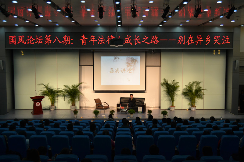 2013年11月11日第八期国风论坛:青年法律人成长之路——“别在异乡哭泣”于逸夫楼刘皇发学术报告厅举行。国风论坛系列讲座由国际法学院分团委主办,国际法学院学生会承办。讲座一直将视角置于时代大局,同时兼顾社会热点,深度剖析社会现状,给予法大学子以深刻思考。与以往不同的是,本次活动由国际法学院学生会职业拓展部与学术部共同承办,一改以往纯学术的风格,力图为全法大学生展现不一样的论坛。出席此次国风论坛讲座的嘉宾是盈科律所的高级合伙人易胜华律师。