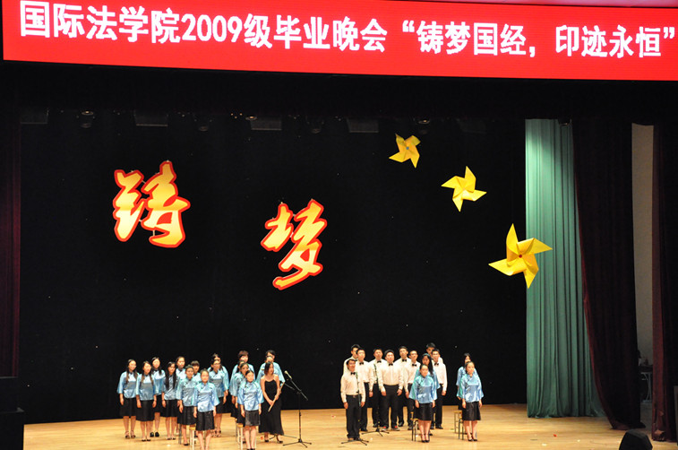 2013年6月29日19时,国际法学院2009级毕业晚会“铸梦国经,印迹永恒”在礼堂拉开帷幕。观看本次晚会的领导和老师有:国际法学院分党委书记兼副院长顾永强老师,国际法学院院长孔庆江教授,国际法学院分团委书记杨俊丽老师、副书记刘凯老师,以及范亚新老师、庚红老师。“铸梦国经,印迹永恒”由2009级邹文博、和晨曦、陈开元、李思晴担任主持人。