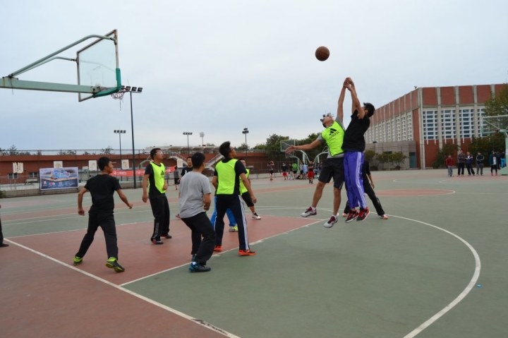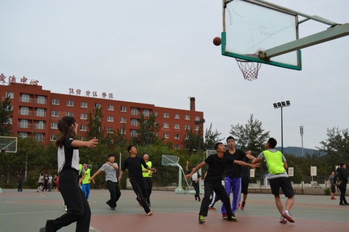 秋风萧瑟,天色灰朦,篮球场上却是一派热火朝天。参赛队员们奋力奔跑在绿色的场地上,传球、抢断、投篮,一气呵成;你来我往,互不相让。首节开始的5分钟之内双方都没有进球。涉外班球员一记漂亮的跳投拉开了双方得分的序幕。两节比赛过后,涉外班暂时落后。第三节比赛换双方各班的女生上场。虽然女球员们没有纯熟的技巧和足够的比赛经验,但她们拼尽全力,没有一丝松懈,为各自班级的荣誉而战。第三节比赛将双方分差增大,使得在场所有的人都为涉外班最后上场的5名队员捏了把汗。