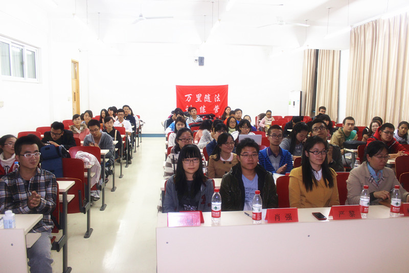 2013年10月17日18时30分,“万里随法”2013级新生训练营开营仪式在端升楼307教室举行。国际法学院分团委书记杨俊丽老师,国际法学院学生会副主席严黎,万里随法训练营模拟法庭特邀培训员肖强、王旭和2013级的新成员们出席了这个开营仪式。