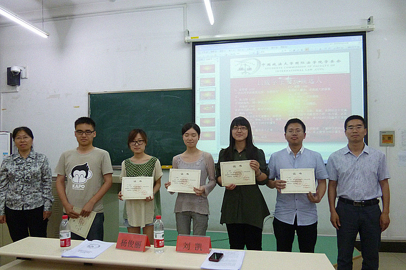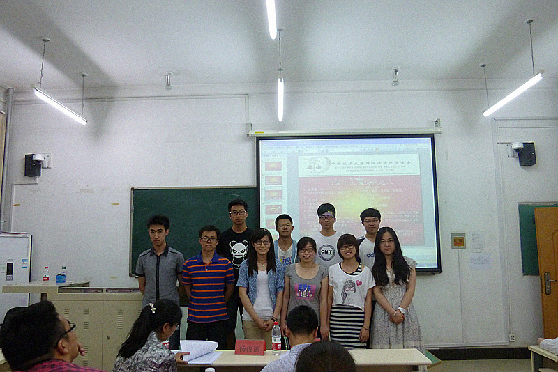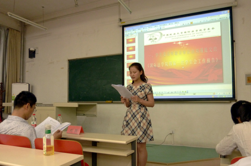 2013517日下午五点半,中国政法大学国际法学院第四届一任学生委员第三次全体委员会议在端升楼104教室举行。国际法学院分团委书记杨俊丽老师、副书记刘凯老师出席了本次会议。本次会议由学委会监察部承办,学委会主任芦嘉鹏主持。本次会议审议了国际法学院学生会、学委会、新闻中心的春季工作报告,通过了学委会、学生会的提案,并且选举出第四届二任学生委员,对卸任的学生委员进行嘉奖。